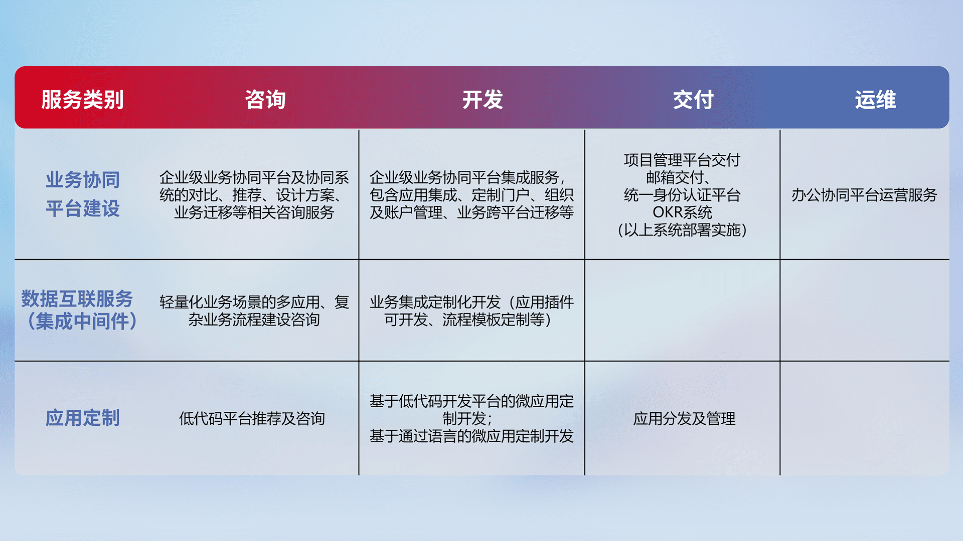 针对钉钉、、、、企微、、IDaas等平台级产品提供产品的规划、、、、方案、、交付、、、、定制化开发等服务,,,,实现如统一协同办公、、、智能客户服务、、、混合会议管理、、、智能数据查询、、等业务场景,,,实现数字化转型。。